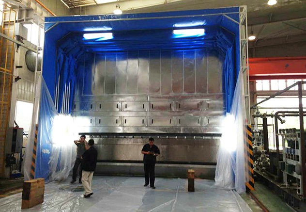 在噴漆房不移動一端安裝有水簾式噴漆柜,噴漆產(chǎn)生的漆霧通過水簾凈化或排放到車間外部,漆霧由水過濾或回到水池中,定期清除。